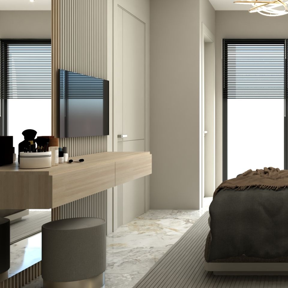 15 m² kullanım alanına sahip yatak odası, ferah planlamasıyla dinlenme ve konforu bir araya getirir. Geniş pencere cepheleri sayesinde doğal ışık alan mekân, aydınlık ve huzurlu bir atmosfer sunar. Doğal ışık sirkülasyonu ile desteklenen tasarımı, modern çizgilerle birlikte sakin ve keyifli bir yaşam alanı oluşturur.